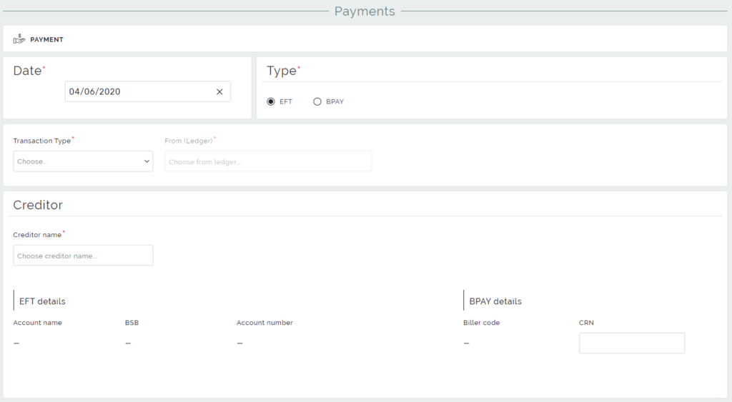 The creditor to be paid has to have the selected Type’s payment details. If EFT, Account Name, BSB and Account Number need to be already set up for that creditor. If BPAY, Biller Code has to be set up already, and CRN will also be needed to be filled.