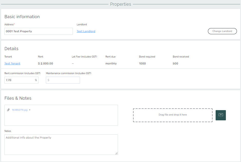 The Property’s details page contains information about the property, such as the address, the owner, and the tenant residing in the property. The information regarding the lease, bond, and fees show when the tenant is linked to this property.