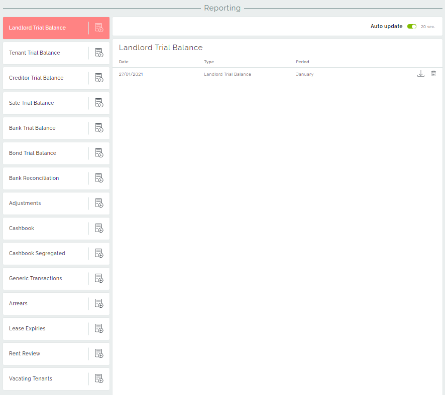 Landlord Trial Balance – Shows the landlord ledger balances, that are/were still in our Trust account by the selected month end. This generally mostly consists of rental income.