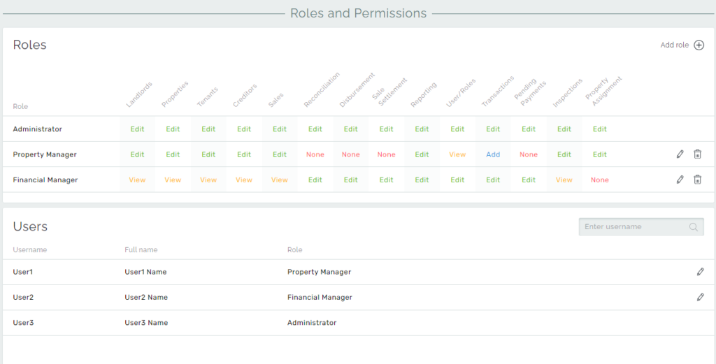 In our system, for entity items, such as Landlords, Tenants, Creditors, Properties, and Sales, we have a full range of permissions. The role can have a combination of permissions for entities and according to them, the user can interact with our system.