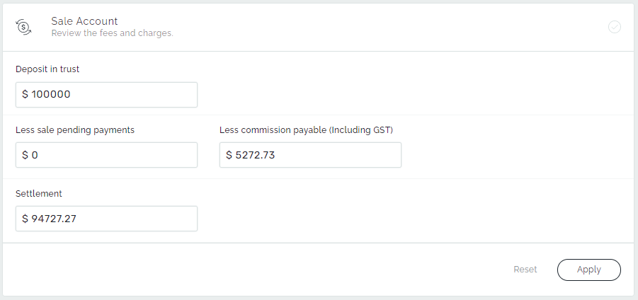 Less commission payable (Including GST) – Shows the sale commission of the real estate agency. It is the representation of the field Commission in the Sale details page.